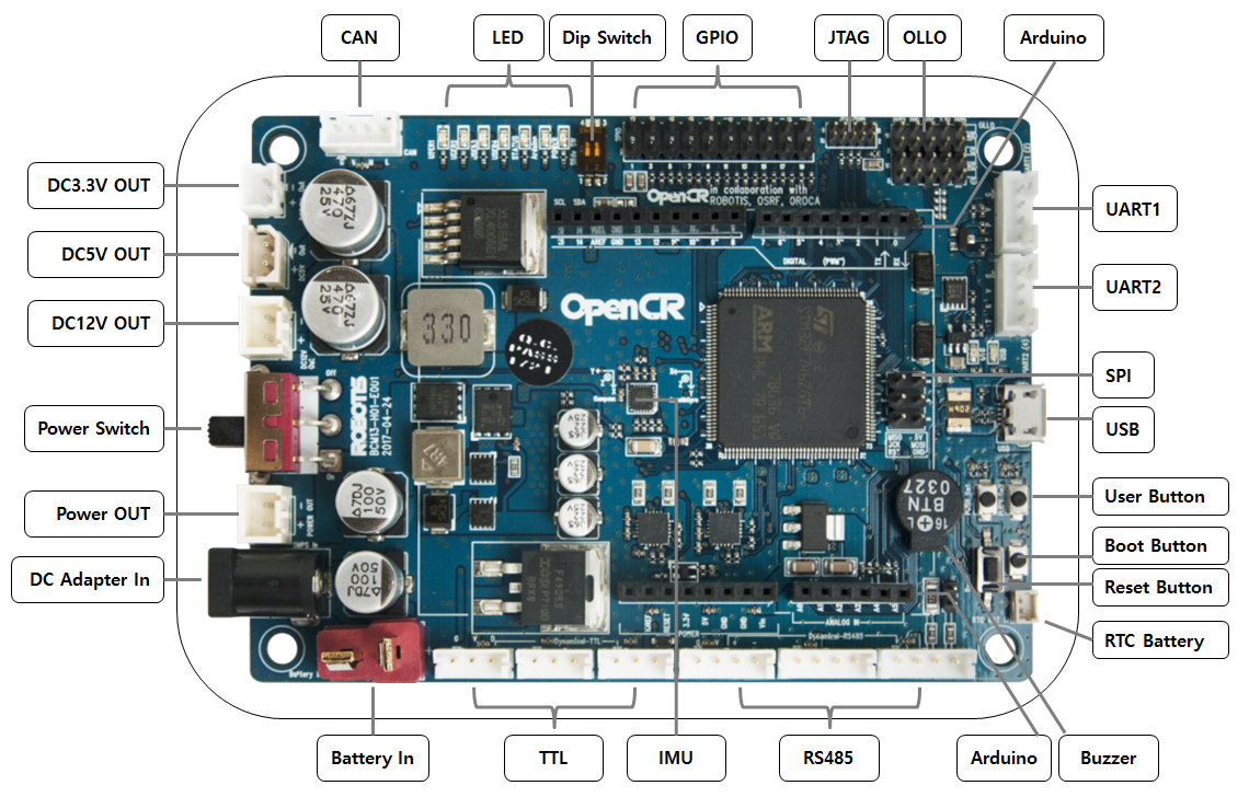 | Communication Ports | USB x 1 (Micro-B USB connector/USB 2.0/Host/Peripheral/OTG) TTL x 3 (B3B-EH-A / DYNAMIXEL) RS485 x 3 (B4B-EH-A / DYNAMIXEL) UART x 2 (20010WS-04) CAN x 1 (20010WS-04) |