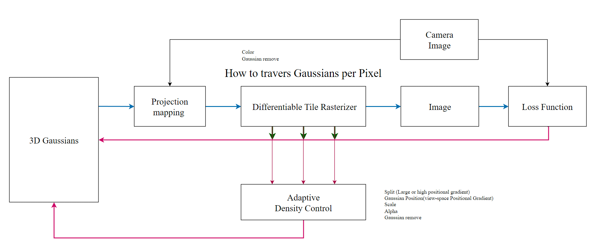 This diagram illustrates the complete pipeline of 3D Gaussian Splatting rendering system. The workflow begins with 3D Gaussians that undergo projection mapping to convert 3D spatial information into 2D screen coordinates. The projected data then passes through a Differentiable Tile Rasterizer, which determines how to traverse and process Gaussians per pixel, ultimately generating the rendered image. The system includes a crucial feedback mechanism through the Loss Function, which compares the rendered image with the target Camera Image to calculate gradients for optimization.