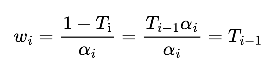 논문에서 설명된 최종 적층된 `alpha` 값 만으로 각각의 가우시안의 적층 값을 산출하는 식이다.