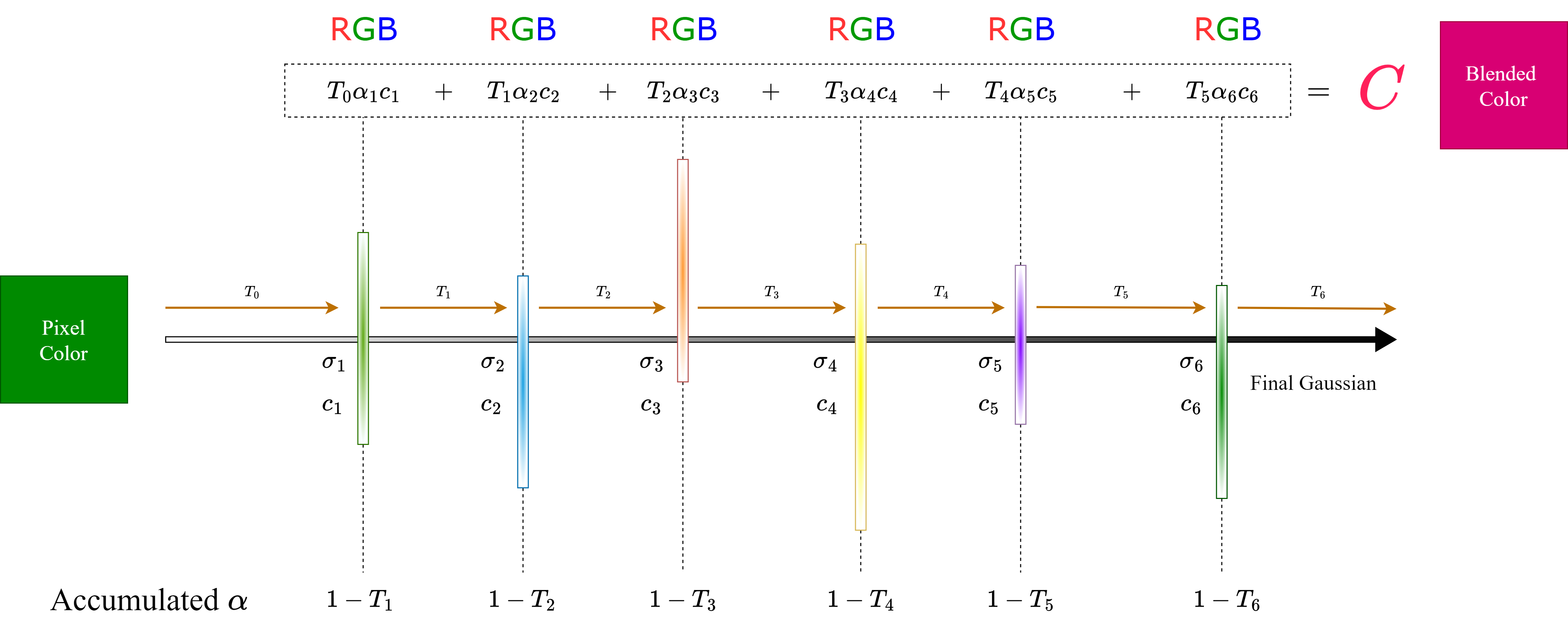 각각의 가우시안의 흡수율을 해당 색상과 곱한 값 값들을 모두 더하여 최종적인 색상의 구성을 출력(표현)한다.