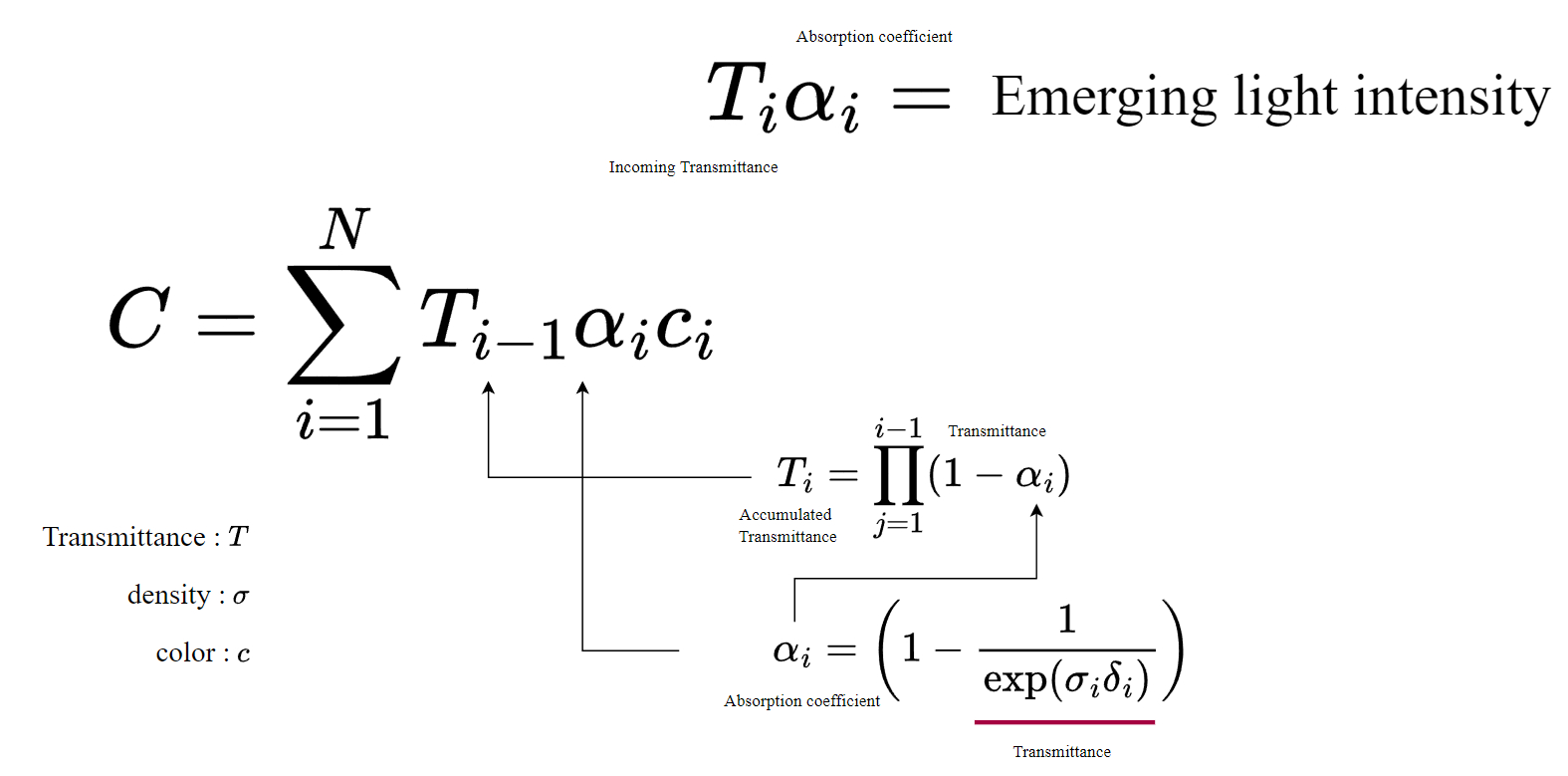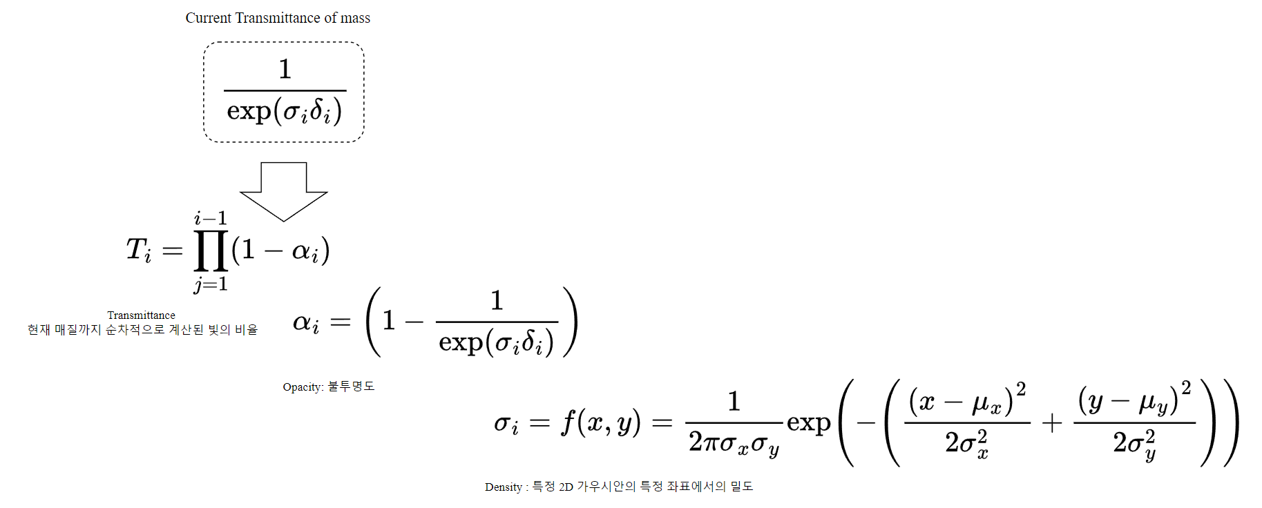 따라서 계산적 편의성을 위해(실제로 이것이 효과적인지는 모르지만 논문으로는 증명되었다) 빛의 투과는 외부에서 안쪽으로 들어오는 방향으로 계산하고, 마지막 가우시안을 투과하고 나온 빛이 `alpha`-Bleding 된 빛의 최종값으로 나오는 것이다.