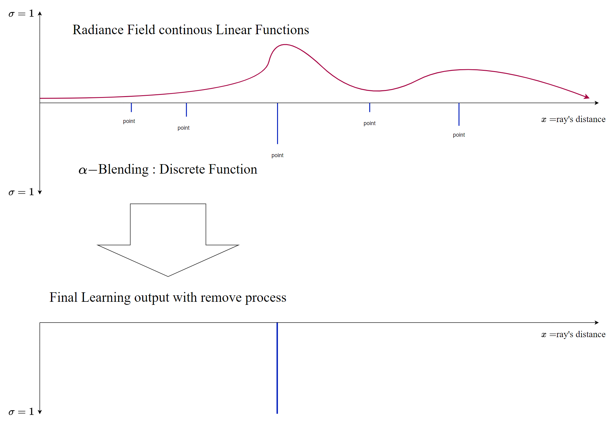 그러나 `alpha`-blending의 경우는 이산적이며 최종적으로는 하나의 포지션에 밀도가 1로 표기될때까지 학습을 반복한다.