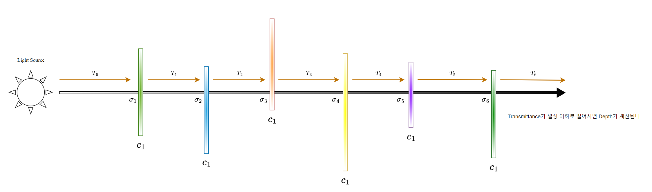 이렇게 6개의 가우시안을 지나가게 되는데 마지막 가우시안의 위치가 Depth 이 된다.