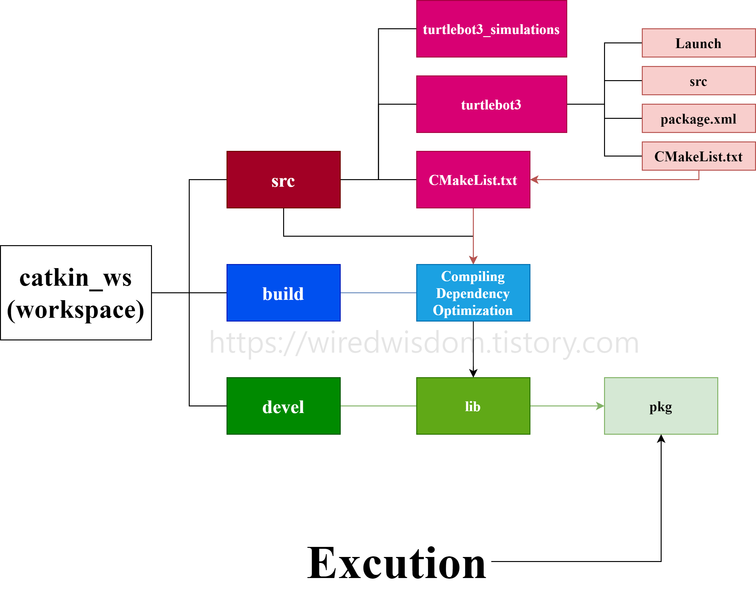Contains the source code for TurtleBot3 packages including turtlebot3_simulations and core turtlebot3 packages with their launch files, source code, package.xml, and CMakeLists.txt. The build directory handles compilation and dependency optimization, transforming source code into executable components. Creates the development environment with compiled libraries (lib) and executable packages (pkg) ready for execution. The final step involves executing the compiled packages, completing the development-to-deployment pipeline.